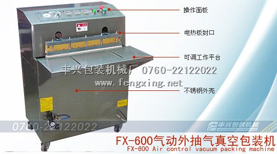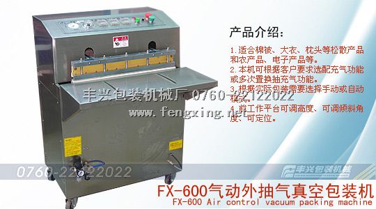 Pneumatic suction vacuum packaging machine for plastic film or plastic composite film for packaging materials. Of solid, chemical, electronic components, cotton products such as can be carried out by vacuum packaging; can effectively prevent the oxidation products, mildew, corrosion, damp after packaging, attain the durability, preservation, security flavor, color retention, extend product shelf life and storage period; at the same time the machine is especially suitable for large fluffy products, such as quilt, cotton sweaters, vacuum packaging, so as to greatly reduce the volume, to reduce the space occupied, today is a novel and ideal vacuum packaging machinery.