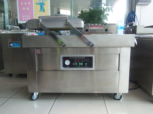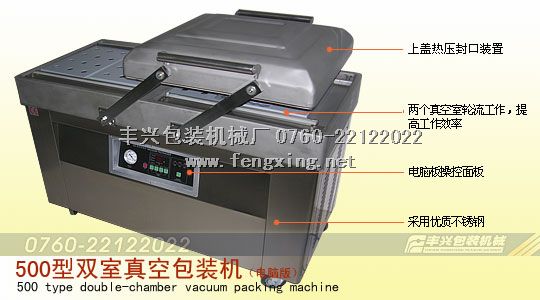 FX-500型雙室真空包裝機由于工作室空間較大,配置有兩個020真空泵,兩個真空室輪流工作,左、右與上蓋工作室采用不銹鋼材料制成,結構合理,氣密性好,并符合食品衛生與防腐要求,上蓋裝有一組熱壓封口裝置,并采用平衡結構,可在任何位置停留,并有緩沖保護。