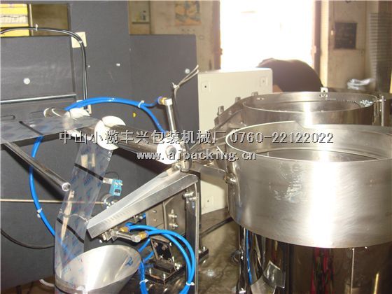 4.在直線送料器末端,安裝有交替運動的小氣缸,兩個氣缸頂針的距離,即是每次包裝下料的數量。改變兩個氣缸頂針的距離,就可以改變每次的包裝量。