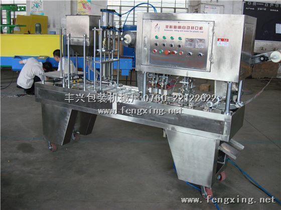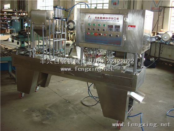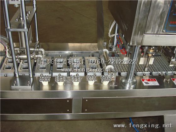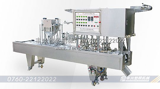 本機具有自動膏體、液體灌裝,自動溫控封口切邊,廢料收卷,全機采用優質材料制造,傳動部件及電氣元件均為國內名牌廠家提供,適合各種規格塑盒(杯),經自動定量灌裝后,進行殺菌、打日期、自動熱合封蓋、剪切、修整、落杯、廢料收卷等功能。