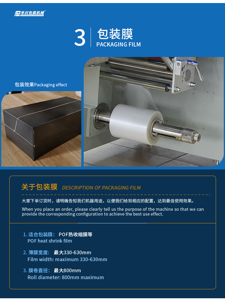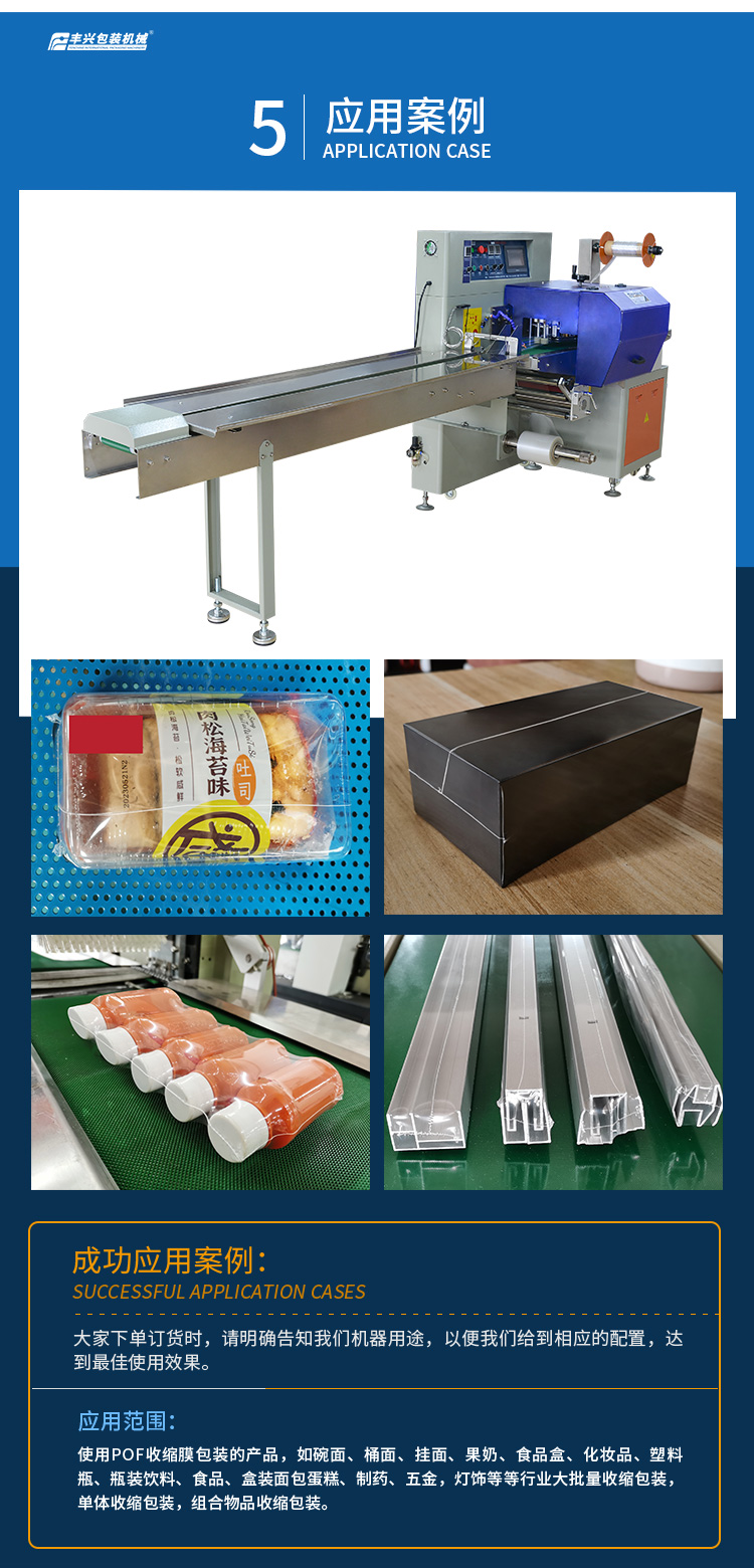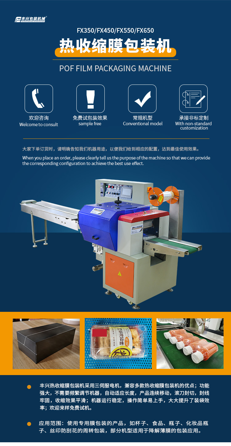 熱收縮膜枕式包裝機采用三伺服電機,兼容多款熱收縮膜包裝機的優點,性能穩定,操作簡單易上手,提升包裝產品裝袋效率;自動化程度高,可以自動識別產品長度,無需人工測量和設置參數,一步到位、省時省膜,輕松完成熱收縮膜包裝,包裝后的產品封合線牢固,收縮效果平滑貼合;是企業熱收縮包裝的好幫手。