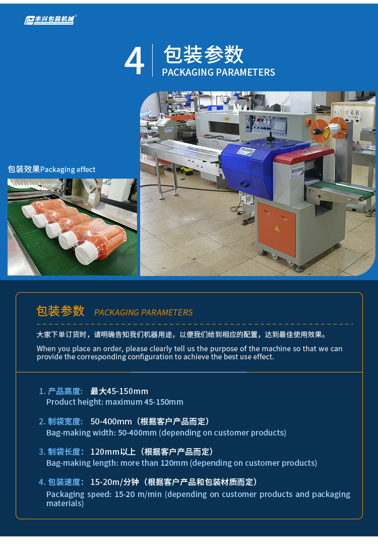 9. 包裝速度: 15-20m/分鐘(根據客戶產品和包裝材質而定)