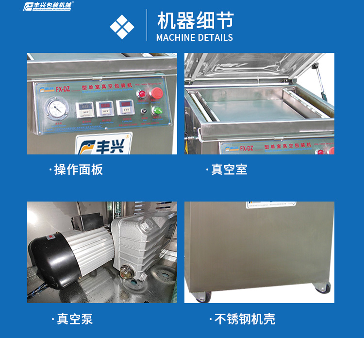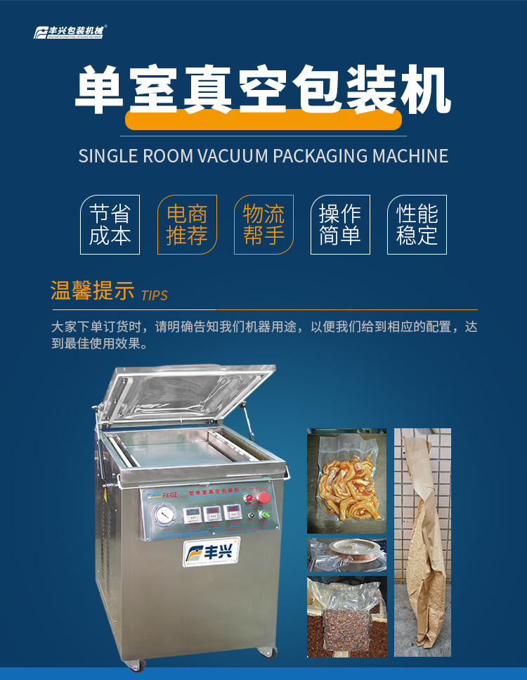 豐興單室真空包裝機是一款專為食品、藥品、電子元件等產品設計的真空封裝設備,通過抽除包裝袋內空氣并熱封口,有效延長產品保質期,防止氧化、霉變及微生物滋生。其核心結構由真空室、加熱條、控制系統等組成,采用不銹鋼材質打造,具備耐腐蝕、易清潔等特點。
