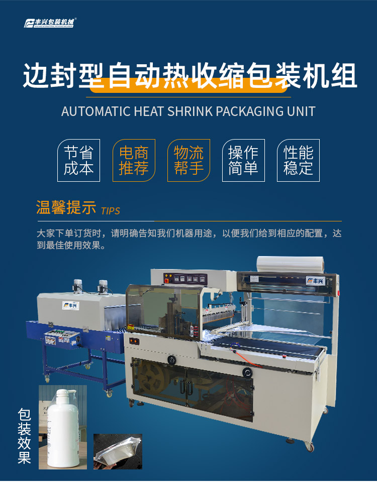 豐興邊封型自動熱收縮包裝機組是一款高效、智能的包裝設備,專為各類規則或異形產品設計,其核心優勢在于對產品長度無限制,可靈活適配不同規格的包裝需求。該機組采用模塊化結構設計,通過智能控制系統協同工作,實現自動送膜、精準邊封、熱收縮及冷卻定型全流程自動化操作。