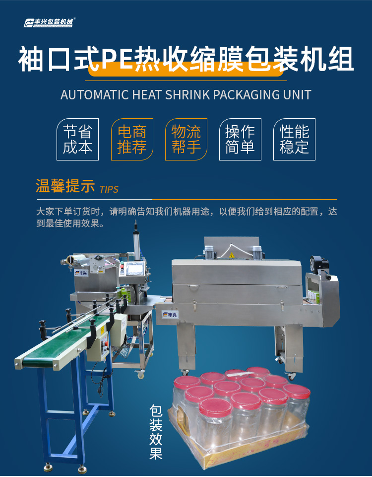 豐興包裝機械旗下產品——袖口式自動熱收縮包裝機組,是一款能夠根據訂單需求實現聯機配線的自動化熱收縮膜包裝設備。該機組采用上下兩片單層的 PE 熱收縮膜作為包裝材料,功能十分多樣。它不僅能夠對單一物料進行熱收縮包裝,還可以針對有底托或無底托形式的一組物料,實現集合式熱收縮包裝。